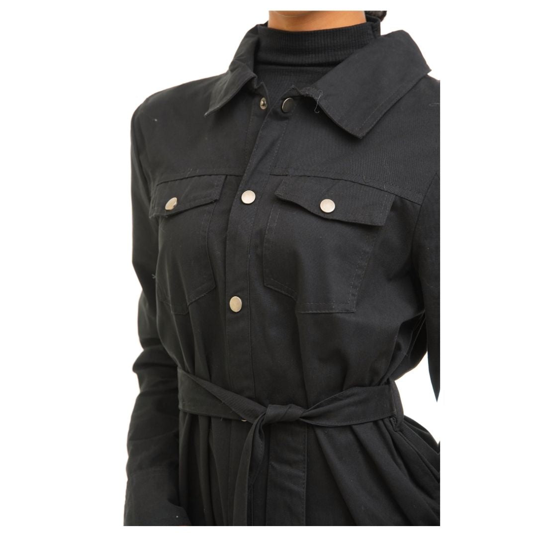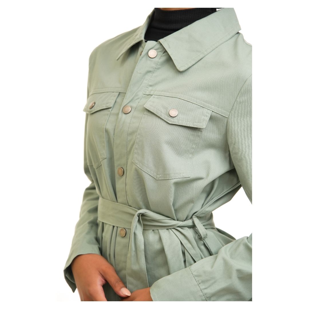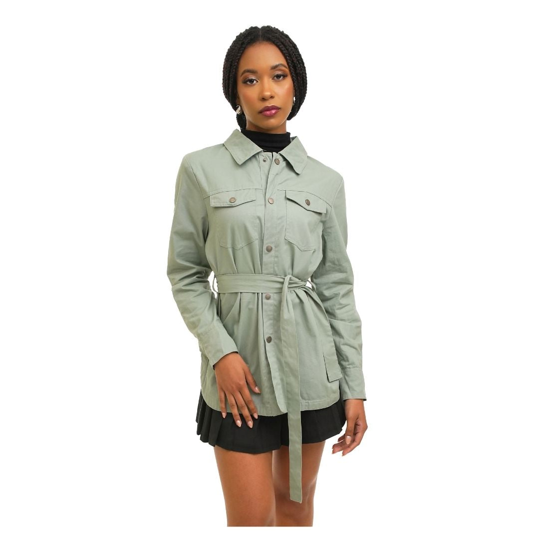 Diseño elevado con una tela suave y discretos botones metálicos. Incluye cinturón para ceñir la cintura, creando una silueta femenina y elegante. Dos bolsillos de parche con solapa y cierre de botones en el pecho añaden un toque práctico. Los puños abotonados te permiten ajustar el ancho de las mangas o llevarlas enrolladas. Perfecto para usar sobre camisetas o blusas cortas durante el clima de transición.