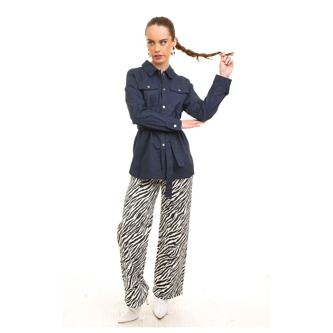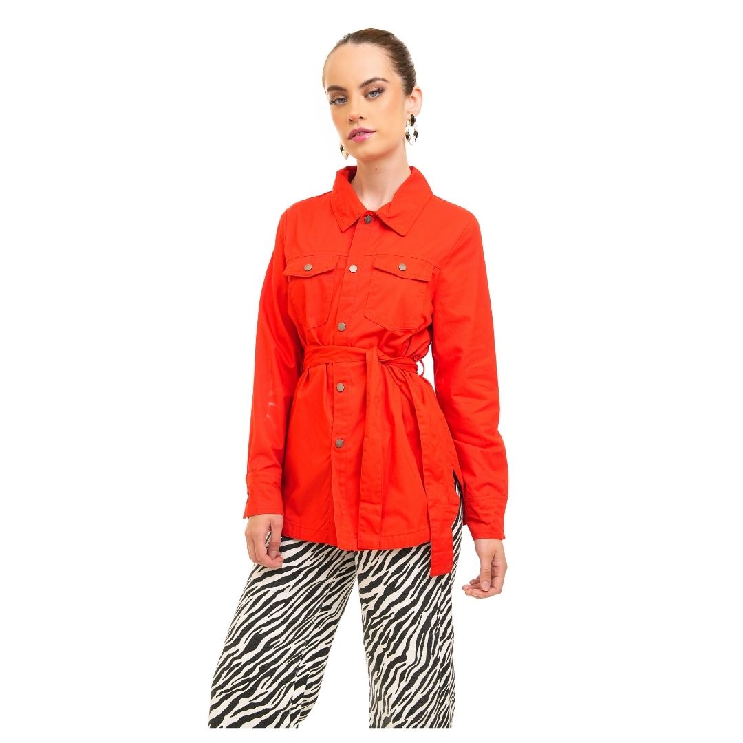 Diseño elevado con una tela suave y discretos botones metálicos. Incluye cinturón para ceñir la cintura, creando una silueta femenina y elegante. Dos bolsillos de parche con solapa y cierre de botones en el pecho añaden un toque práctico. Los puños abotonados te permiten ajustar el ancho de las mangas o llevarlas enrolladas. Perfecto para usar sobre camisetas o blusas cortas durante el clima de transición.