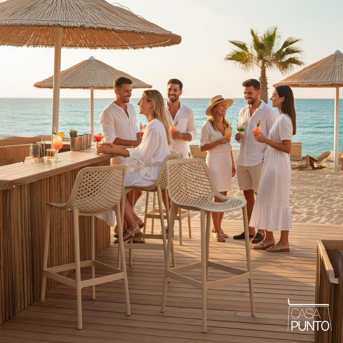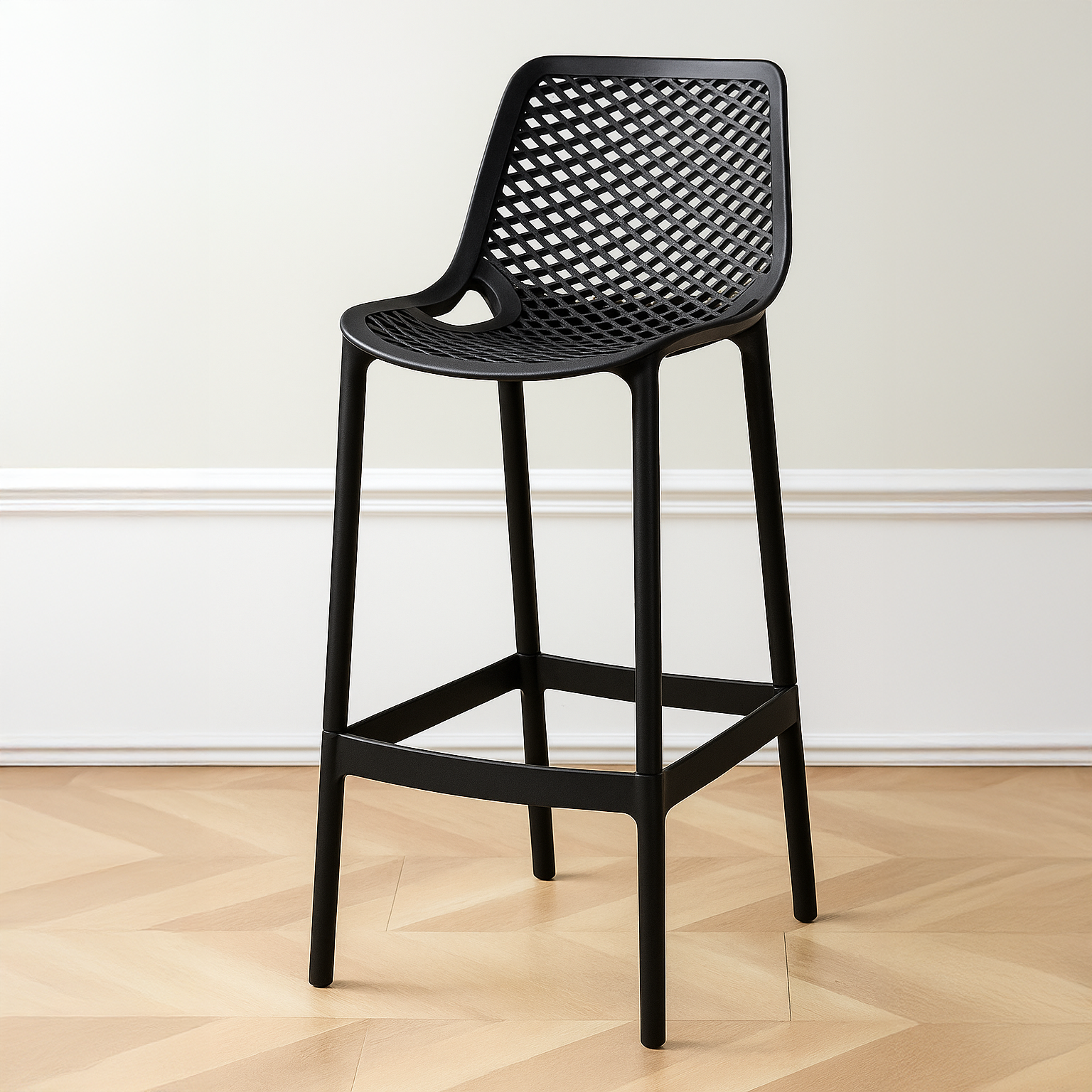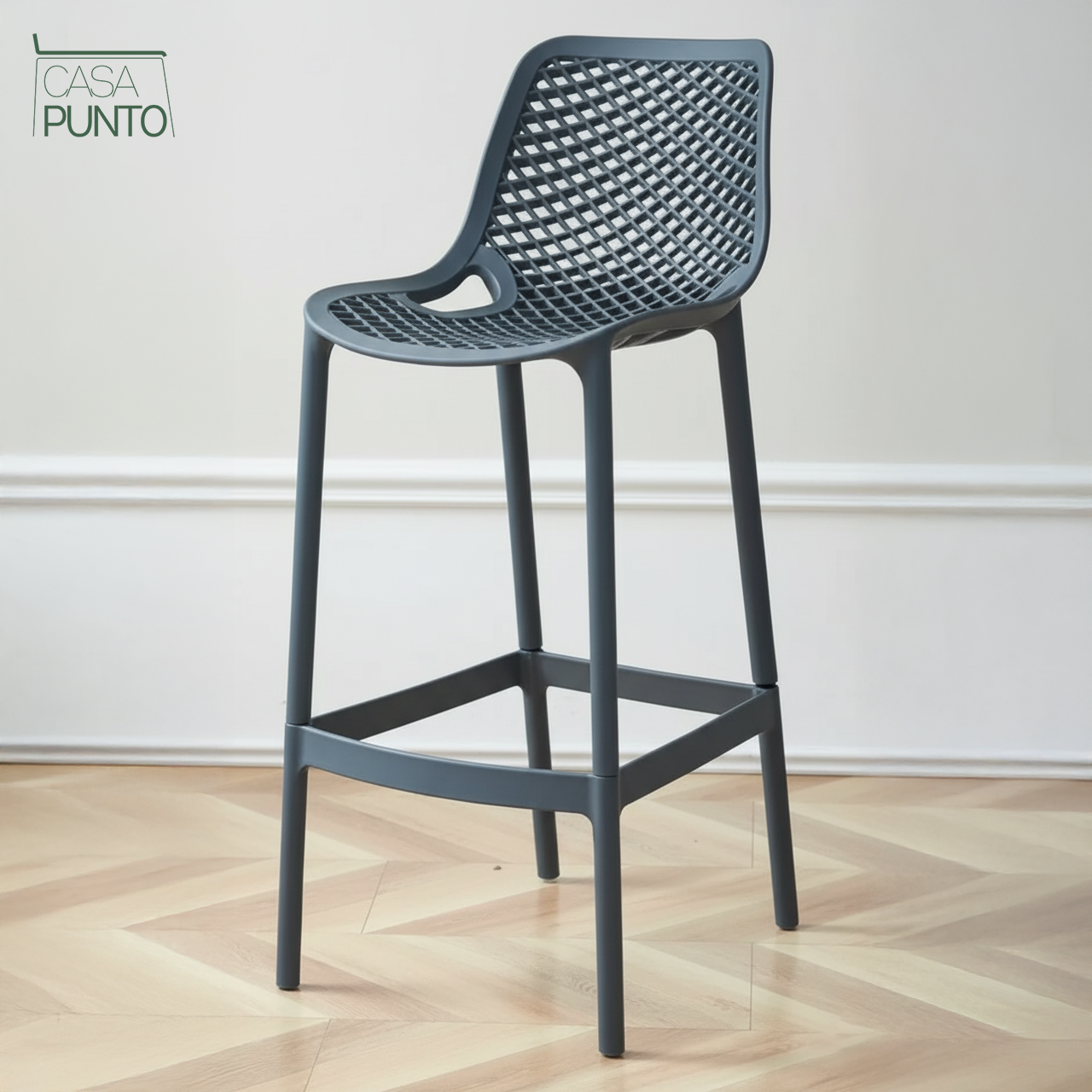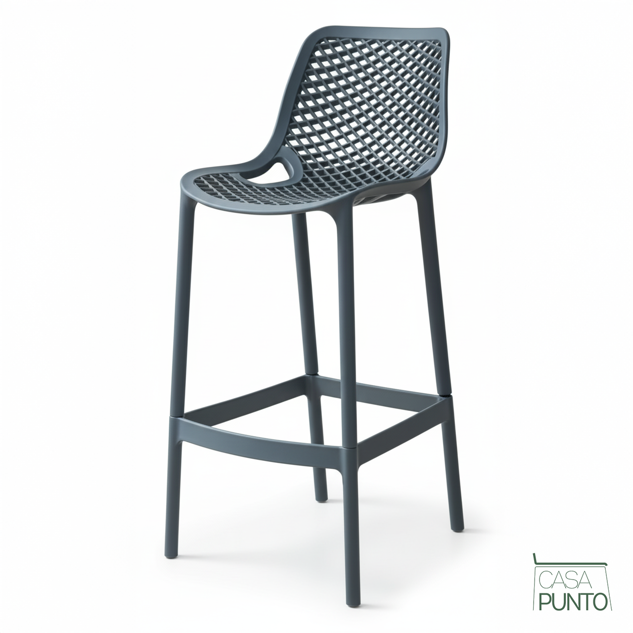 Una pieza estrella de la colección CASA PUNTO, el taburete alto Dorte combina un diseño contemporáneo con una funcionalidad superior. Su característica principal es el respaldo y el asiento ergonómicos, ambos con un sofisticado patrón de rejilla perforada que no solo aligera su apariencia visual sino que también garantiza una ventilación óptima, perfecta para cualquier época del año.