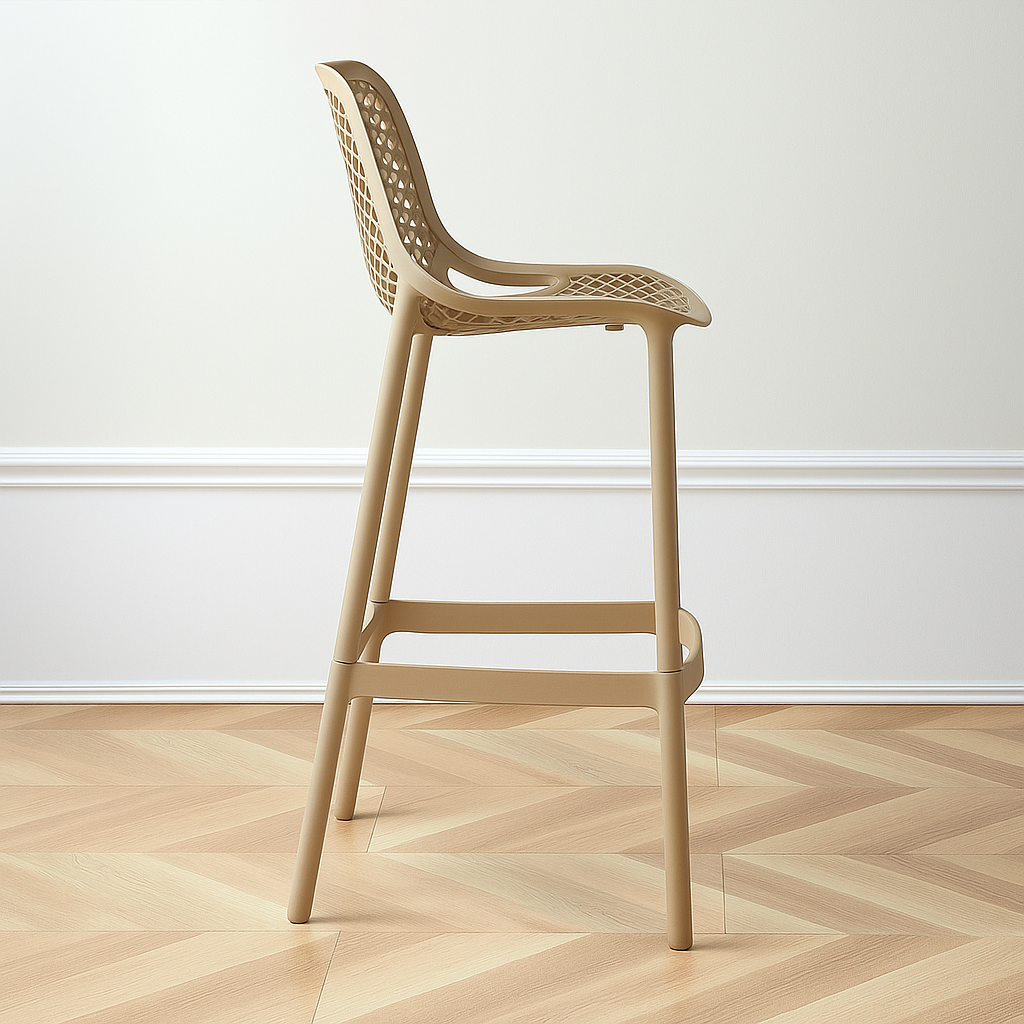 Fabricado a partir de una sola pieza de polipropileno espesado de alta durabilidad, este taburete color camel está diseñado para soportar un uso intensivo sin perder su encanto. Su estructura de cuatro patas se complementa con un reposapiés cuadrado a juego, lo que garantiza estabilidad y comodidad.