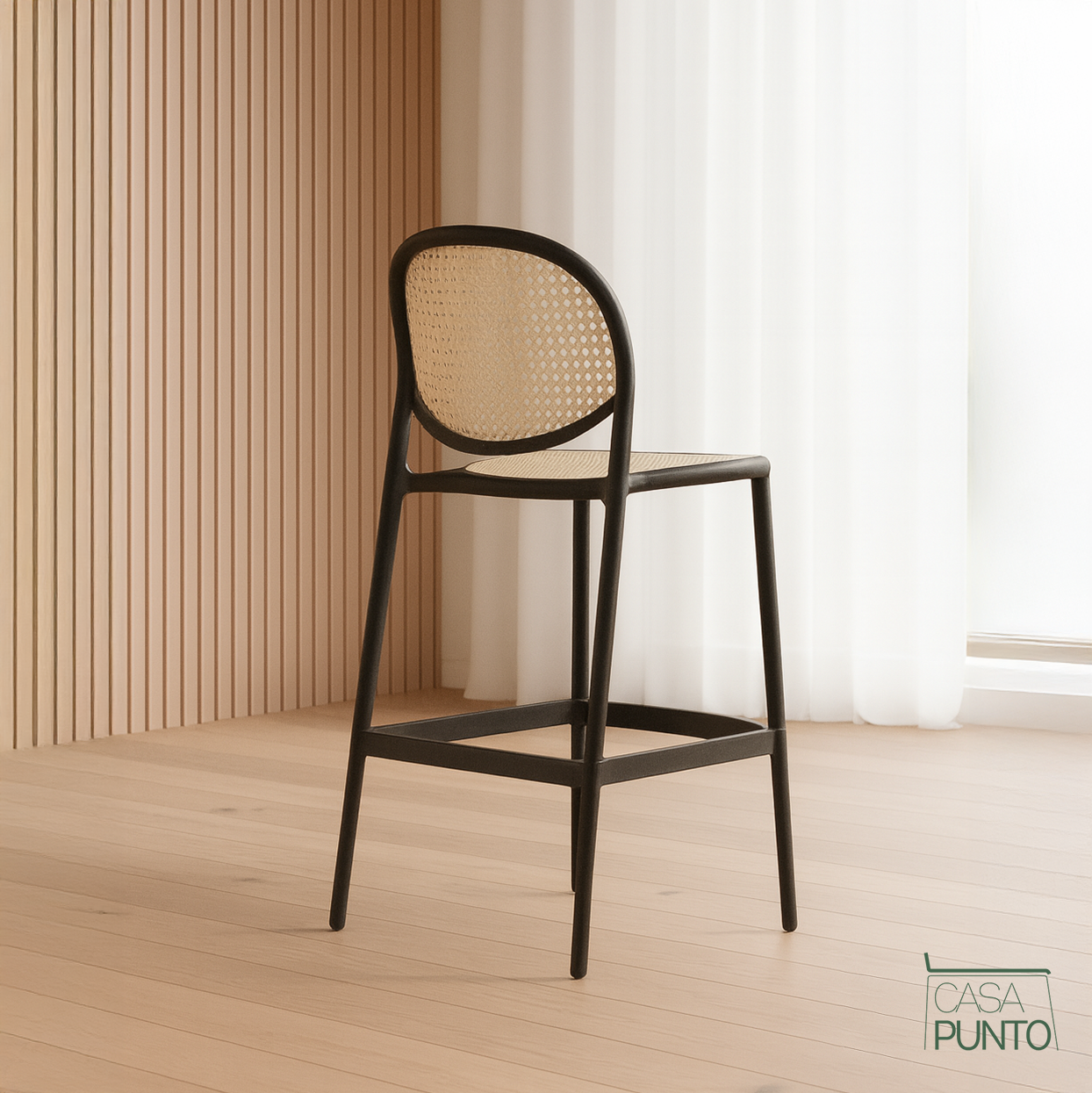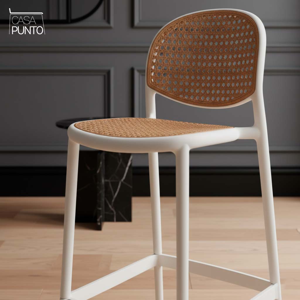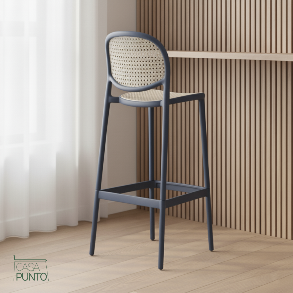 Lleva el encanto de un bistró parisino a tu hogar. El taburete de bar Hedda de la colección CASA PUNTO es una obra maestra de diseño atemporal. Su respaldo presenta un elegante tejido de imitación de ratán en un tono cálido, creando esa clásica textura "cannage" que evoca la cultura del café europeo. El marco, con un sofisticado acabado en grafito, proporciona un contraste sorprendente y una durabilidad excepcional.