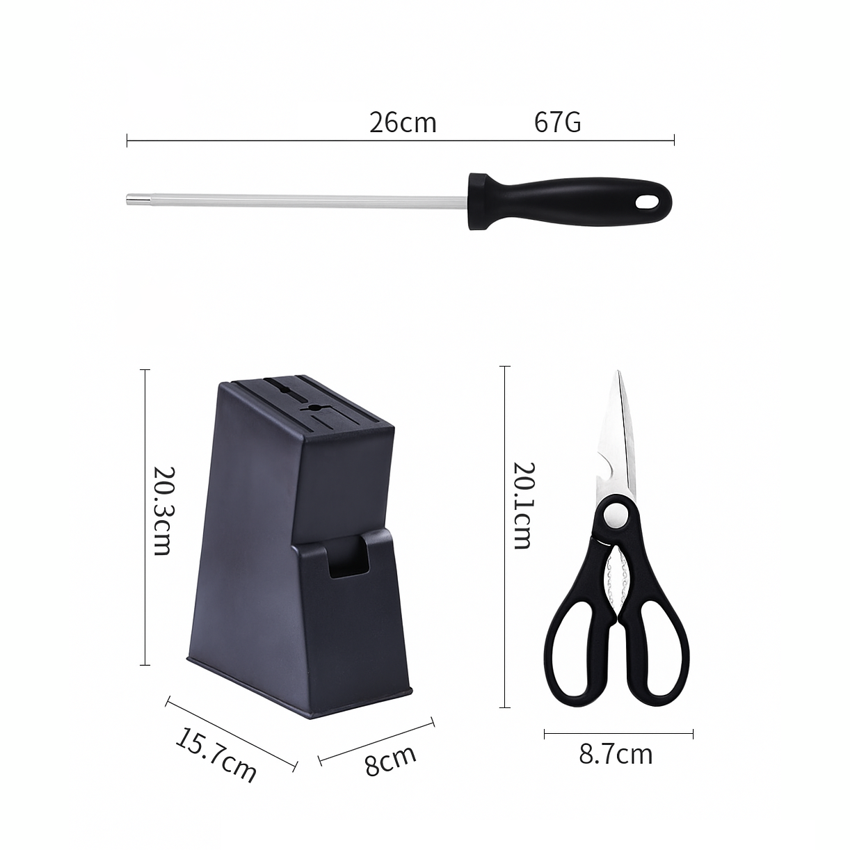 - El juego esencial de 6 piezas incluye los cuchillos más usados, además de tijeras y un bloque de madera