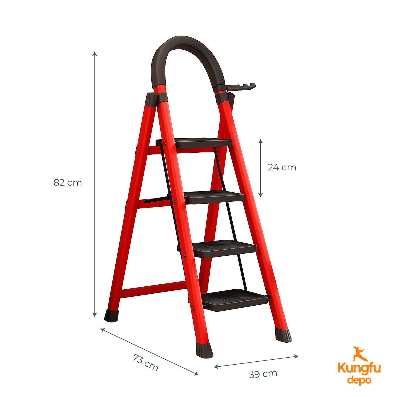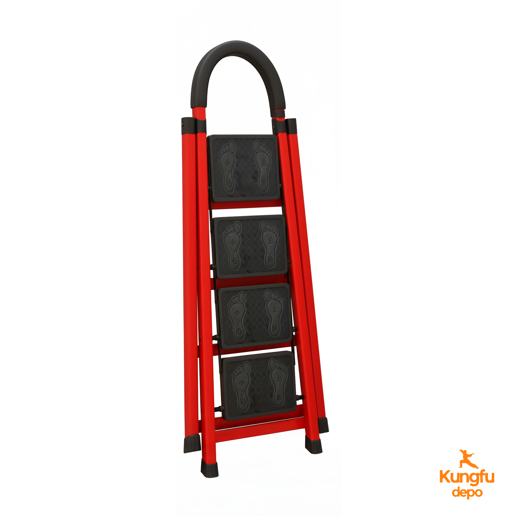 Alcance nuevas alturas con confianza y seguridad de nivel profesional. La escalera plegable de 4 escalones Rhino Big de KUNG FU DEPOT es la escalera doméstica definitiva que brinda seguridad y capacidad de carga pesada de 200 kg a su hogar, garaje o taller. Esta no es solo una escalera de mano: es una plataforma de trabajo elevada completa con manija de seguridad, bandeja de herramientas, escalones antideslizantes y una construcción duradera de acero rojo que maneja todo, desde cambiar bombillas hasta alcanzar estantes altos con estabilidad y confianza.