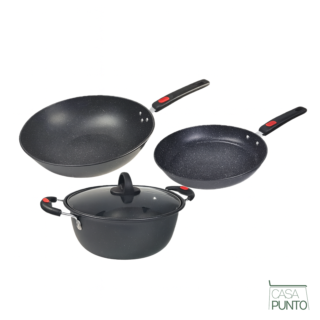 - El juego esencial de 3 piezas incluye wok, sartén y olla con tapas de vidrio para una cocina versátil