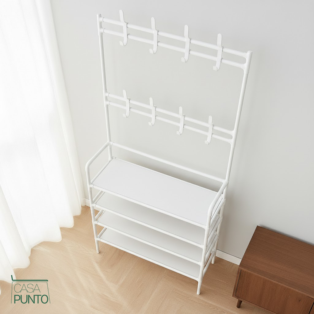 Transforma tu entrada en un santuario organizado. El organizador de entrada de 4 niveles Borg de la colección CASA PUNTO es la solución todo en uno que conquista el desorden en la puerta de entrada. Este no es solo un perchero, es un sistema de entrada completo que combina ganchos para abrigos, almacenamiento de zapatos y estantes en un diseño elegante que ahorra espacio.
