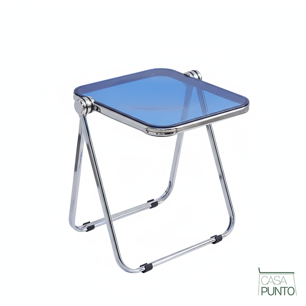 Elegancia que se pliega. La mini mesa Mio de la colección CASA PUNTO es la definición de lujo ligero. Su tapa está elaborada en acrílico transparente que parece flotar en el aire, mientras que sus esbeltas patas de acero cromado añaden un toque de sofisticación. La magia radica en su diseño plegable: las patas se pliegan en segundos, transformando esta elegante mesa auxiliar en una pieza delgada que se desliza debajo de un sofá o en un armario.