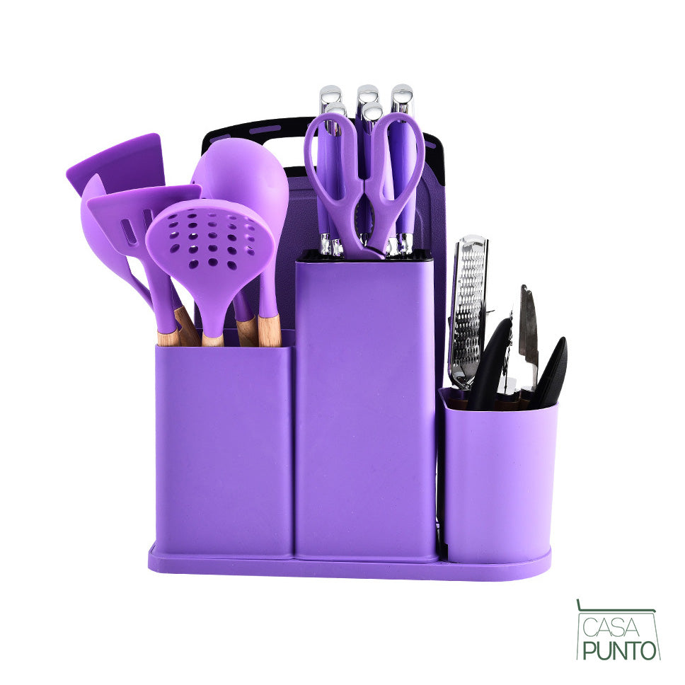 Dale a tu cocina una personalidad vibrante y un rendimiento profesional. El juego de cuchillos y utensilios de cocina Lyra de 20 piezas de la colección CASA PUNTO es la solución todo en uno definitiva que transforma tu cocina en un colorido paraíso culinario. Este no es solo un juego de cocina, es un ecosistema de cocina completo en un impresionante color púrpura que incluye utensilios de cocina, cuchillos, utensilios y organizadores.