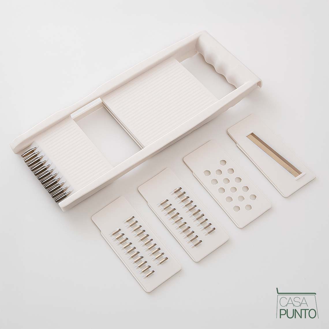 Corta, corta en juliana y ralla con precisión profesional y total seguridad. La cortadora de mandolina Sigi de 5 cuchillas de la colección CASA PUNTO es la solución de corte versátil que transforma verduras y frutas en cortes perfectamente uniformes en segundos. Esto no es solo una mandolina, es un sistema de corte completo con cinco cuchillas de acero inoxidable intercambiables y un protector de mano para una preparación de alimentos segura y eficiente.